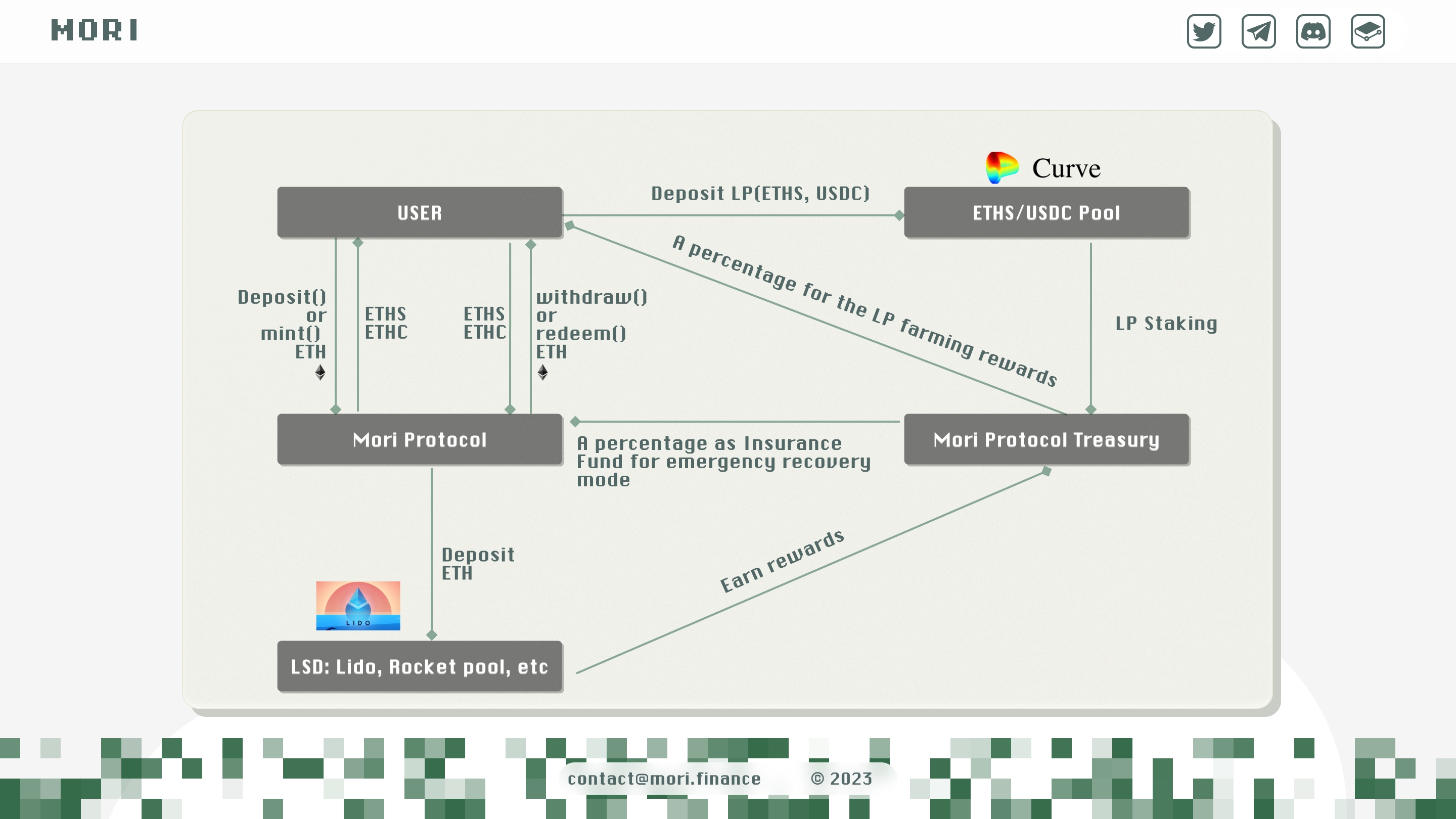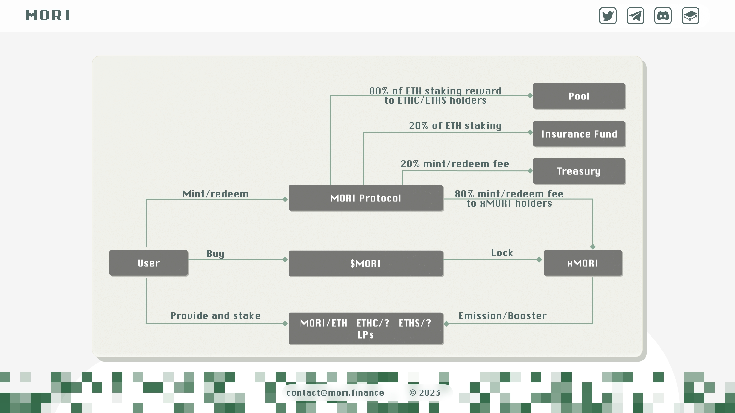 The Mori Protocol aims to offer an alternative risk/return profile through a single primary fund that mirrors the performance of a particular underlying asset. It utilizes LSD (Liquid Staking Derivatives) as its foundation. Initially, the protocol relies on ETH staking assets issued by Lido Finance and stETH as its core elements. However, there are future plans to incorporate additional LSD assets into the protocol.